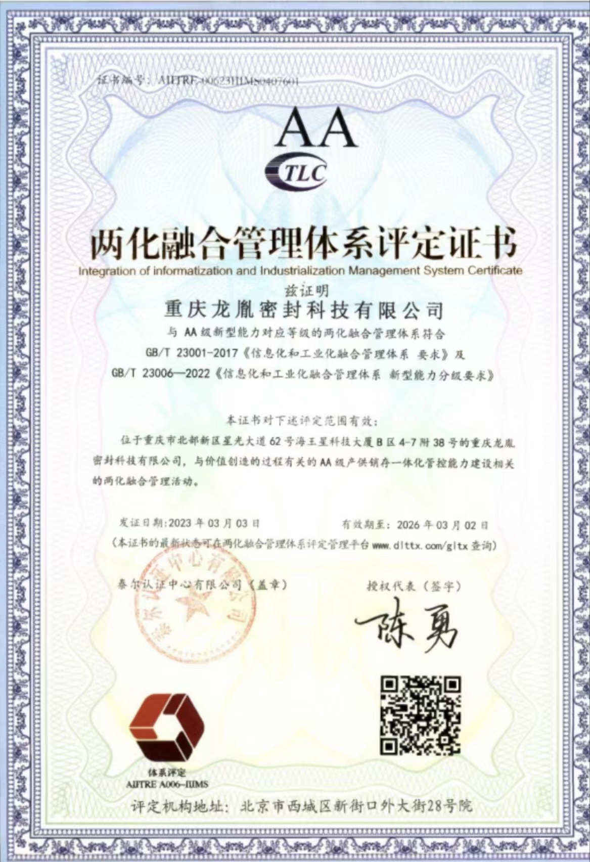 重庆龙胤密封科技有限公司取得两化融合管理体系认证是对其在数字化转型和智能化升级方面取得显著成就的认可。这一认证不仅标志着企业在推进信息化和工业化融合方面取得了新突破,还意味着企业在生产、管理、销售等各个环节实现了深度融合,提升了生产效率和产品质量,降低了运营成本,增强了市场竞争力